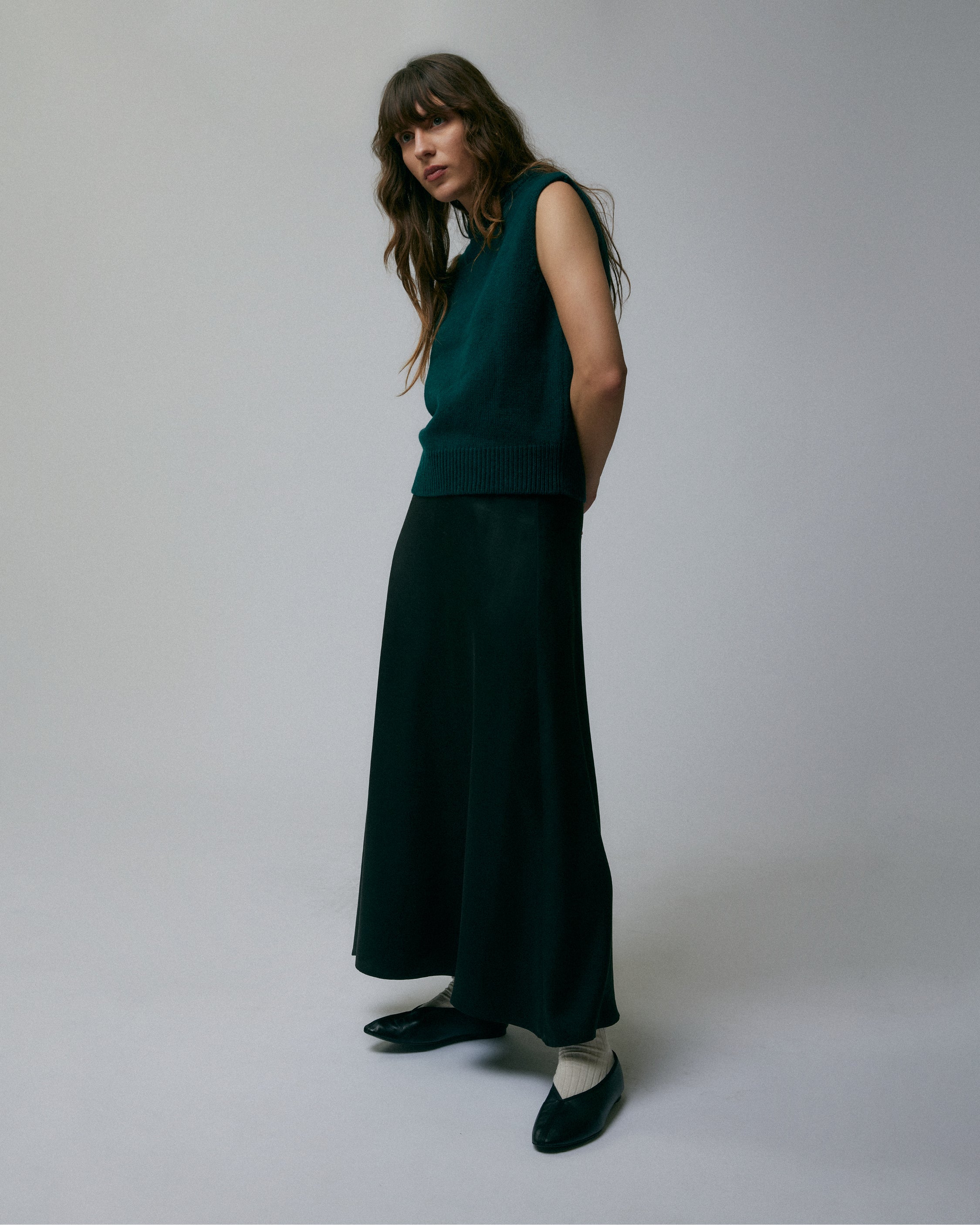 The Nera vest features clean, neat armhole finishes, a relaxed cropped volume with a ribbed crew neck. Pair it with the Venla skirt for a standout autumn look.