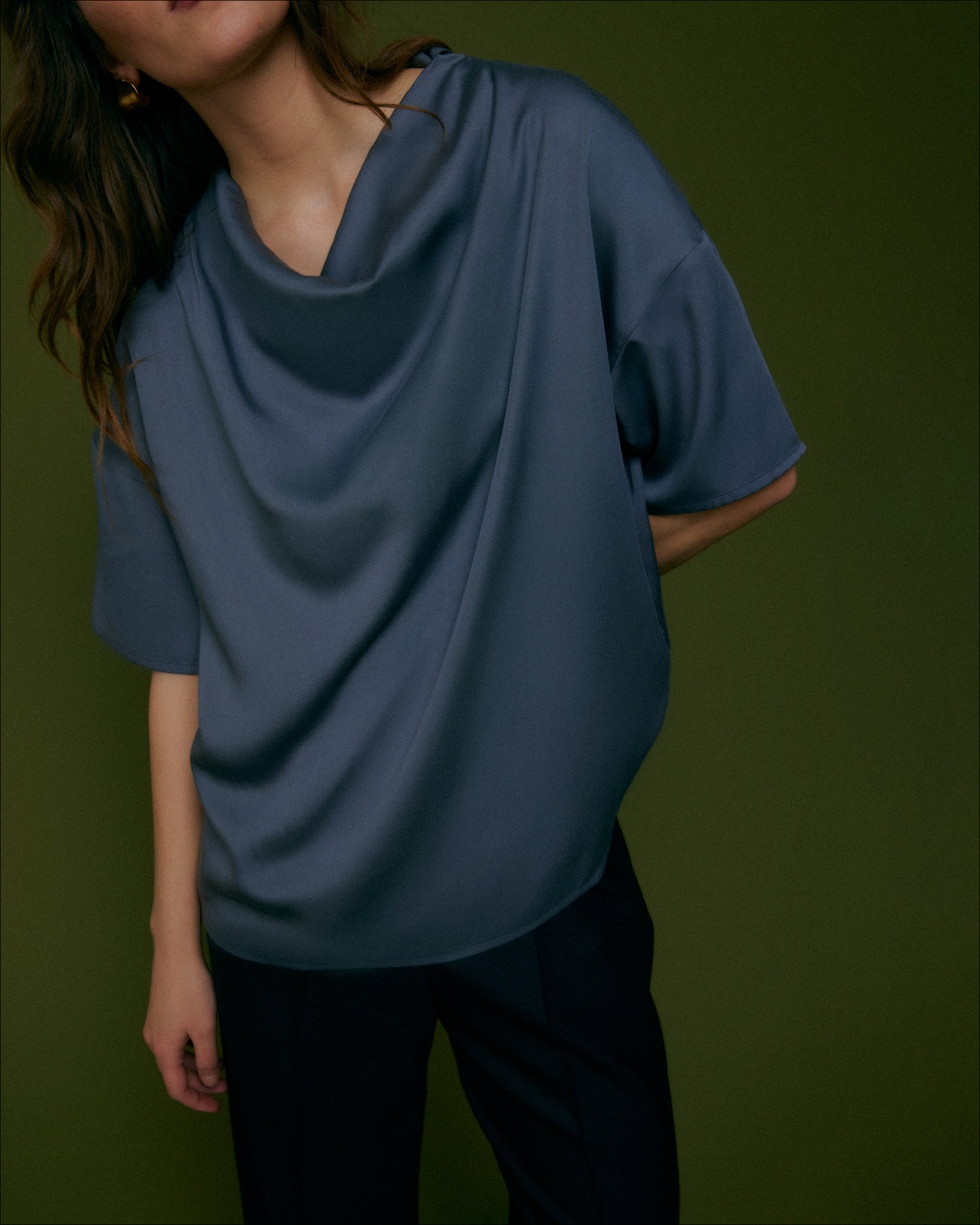 The Amita blouse features a relaxed, roomy t-shirt fit with dropped armholes, and a softly draped cowl neckline. Made from 100% satin Tencel, it offers an effortless slouch and sheen.