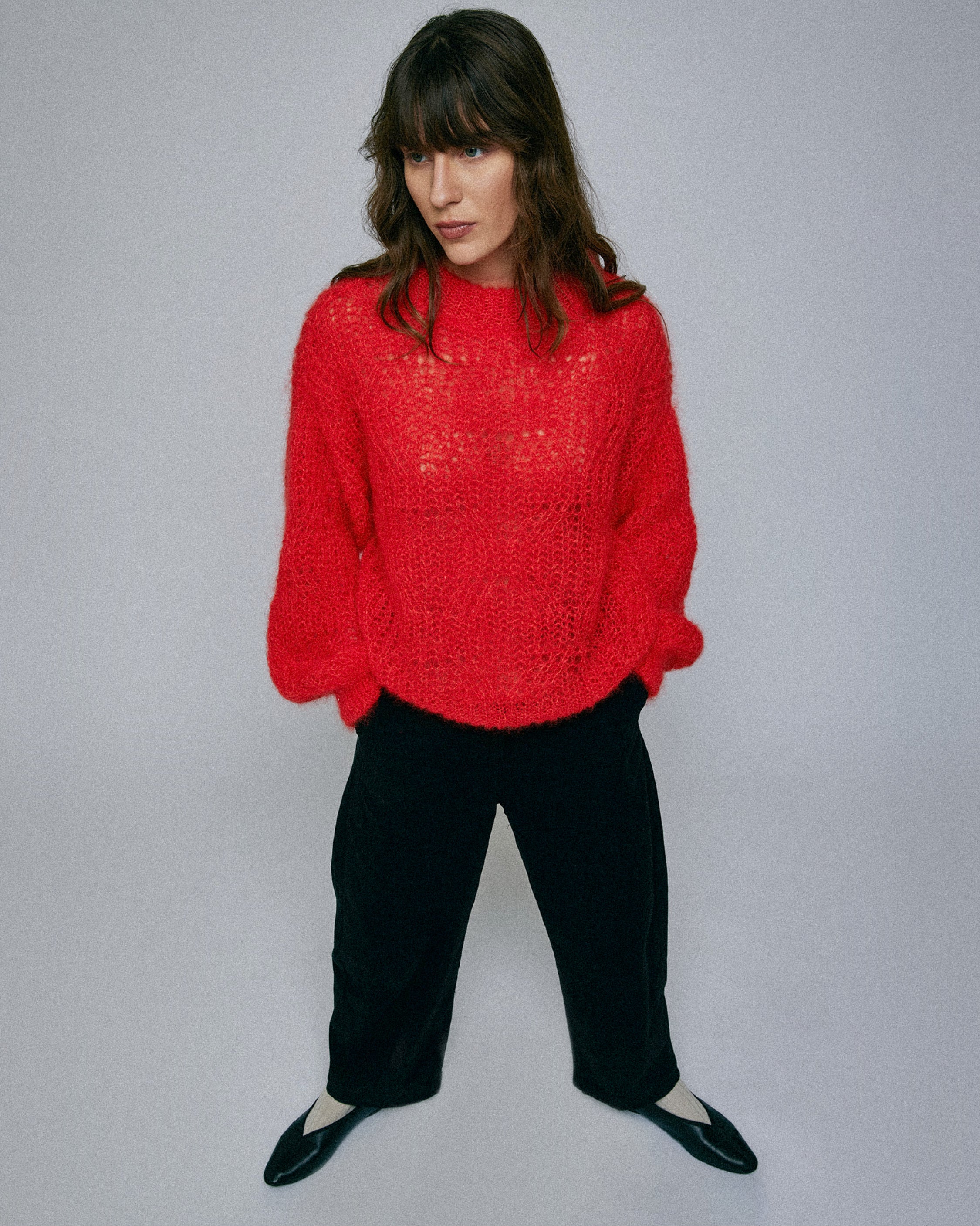 The Fanna sweater in cream white and the Aya pants in poppy red create an autumn combination that feels both unique and comfy. The soft wool and cashmere blend meets organic cotton corduroy.