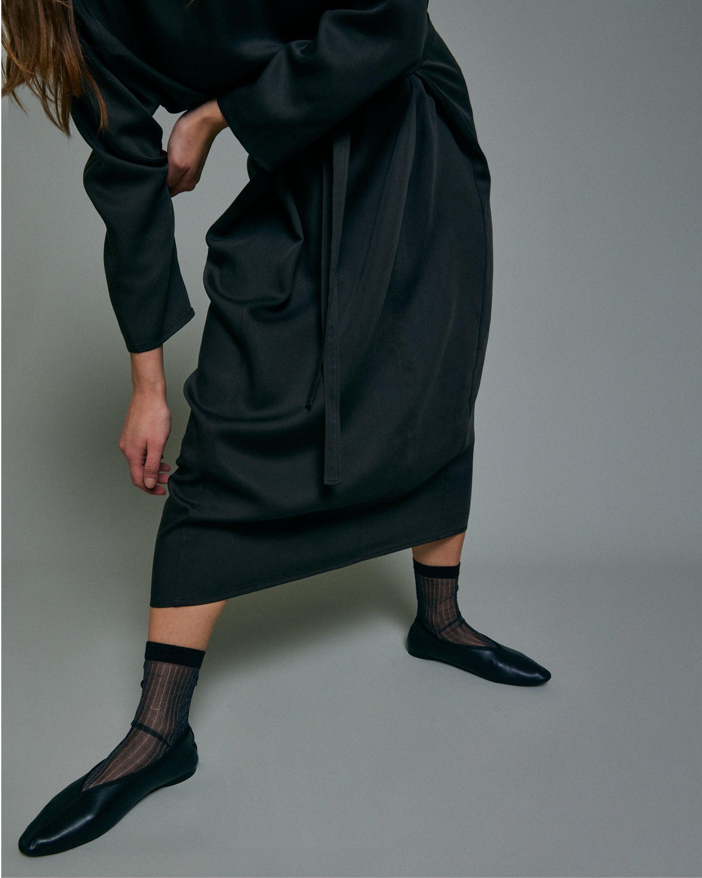 The Gati dress is created using a zero-waste approach, featuring a long silhouette, long kimono-cut sleeves, and a round neckline. Made from mid-weight 100% lyocell twill, this dress offers an effortless drape and sheen.