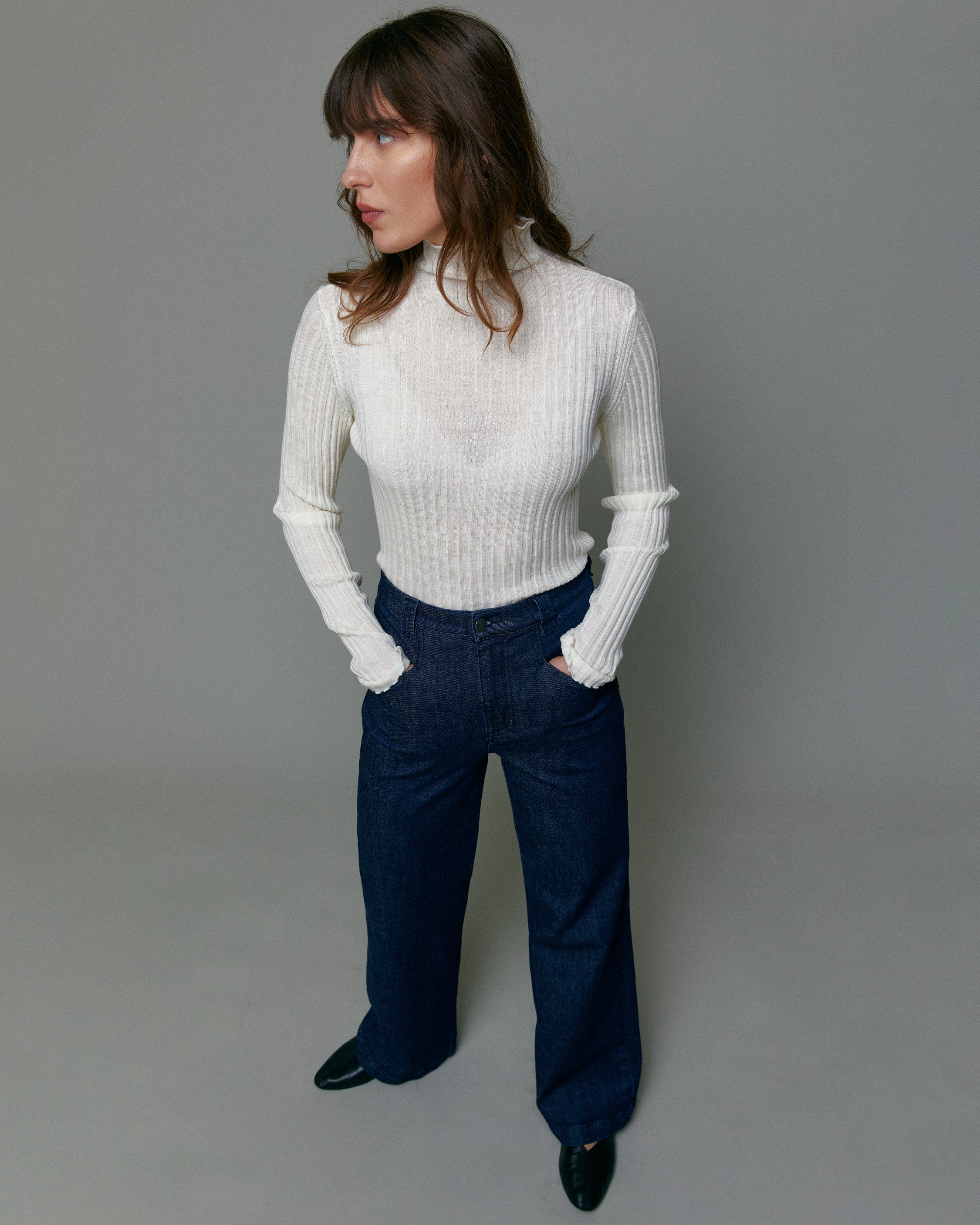 The Nona trousers are made from a cotton and cashmere blend, featuring a subtle barrel leg and ankle-length cut. The medium-weight twill fabric boasts a beautiful drape, creating a casual yet effortlessly luxurious look. Pair them with a knitted sweater, like Dove.